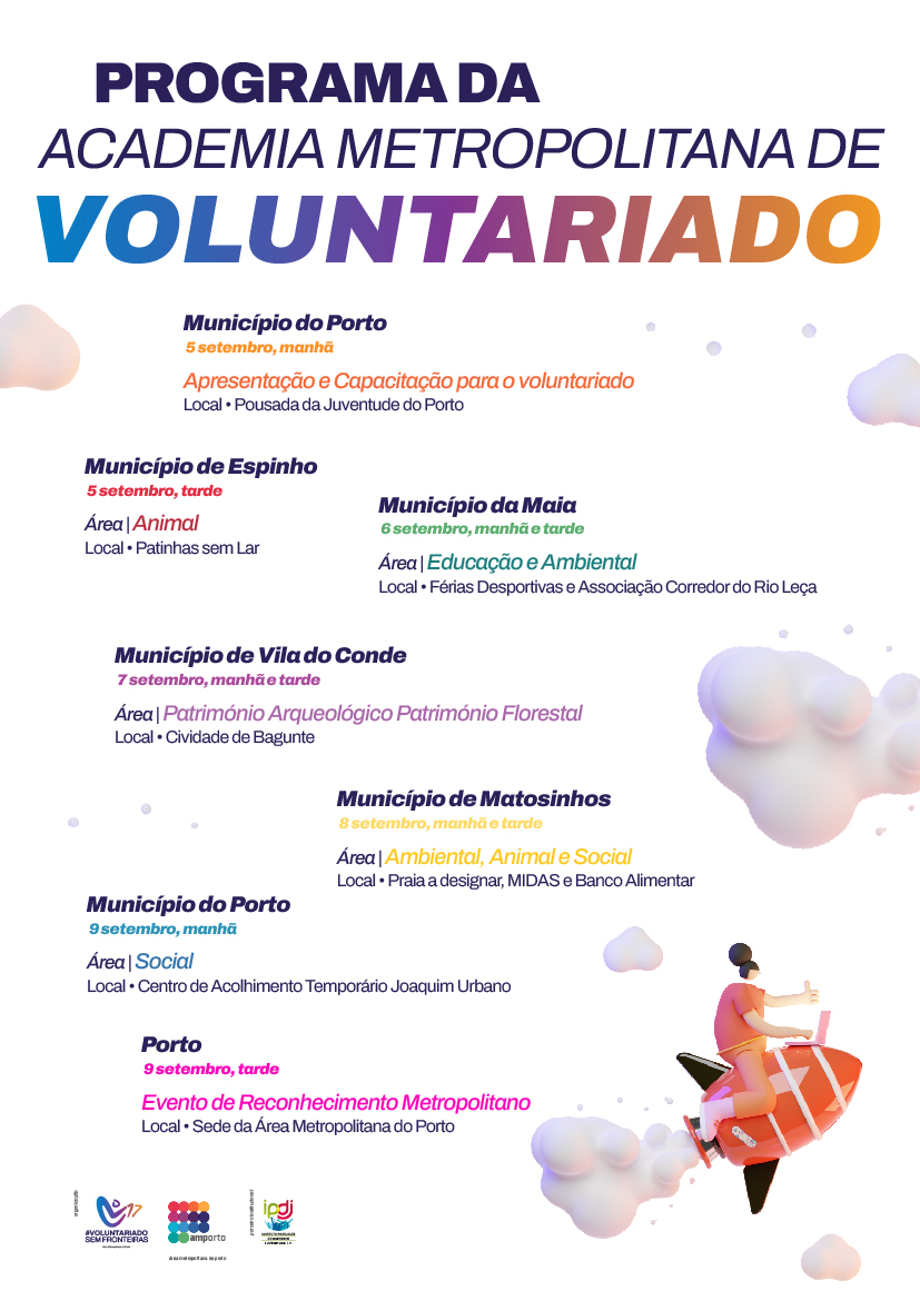 Entre o dia 5 e 9 de setembro de 2022 realiza-se a I Edição da Academia Metropolitana do Voluntariado, uma iniciativa piloto da Área Metropolitana do Porto, desenvolvida com a Pista Mágica e em parceria com o IPDJ, que pretende dinamizar o Voluntariado Jovem nos 17 Municípios.
